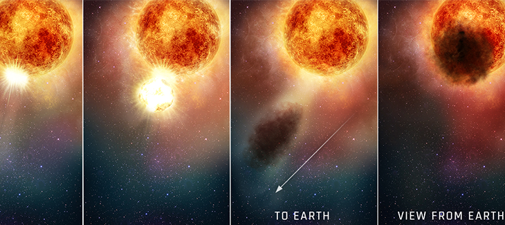 Hubble’s ultraviolet observations showed that Betelgeuse’s dimming was caused by the ejection of hot material into space, forming a dust cloud, blocking light from a quarter of its surface.