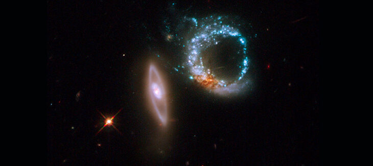 Banner image: Unusual duo: Arp 147 is an interesting pair of interacting galaxies. The left one seems undisturbed, while the galaxy on the right has been shaped into a ring and is experiencing vigorous star formation. Credit: NASA, ESA and M. Livio (STScI)
