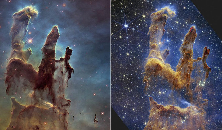 This composite image shows the Pillars of Creation taken by NASA’s Hubble Space Telescope in 2014 (left) and NASA’s James Webb Space Telescope in 2022 (right). | Photo credit: AP/PTI (Space Telescope Institute Public Affairs)