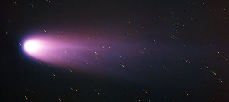 Halley’s Comet is a periodic comet seen from Earth every 75-79 years. It was named after the English astronomer Edmond Halley. The comet’s nucleus consists of dust, ice, and frozen gases. The comet was last seen in 1986 and will next appear in mid-2061. The first appearance of Halley’s Comet in the historical record dates back to 240 BC. The comet has a well-developed ion tail that exhibits the characteristics of tail rays, condensations, kinks, and an overall helical structure and may even experience a breakup event where part of the ion tail detaches.