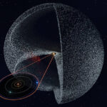 The comet made its closest approach to Earth on April 10, 837, at a distance of 0.04 AU (6 million km, 3.7 million miles). The gravitational influence of the planets caused the orbital period of Halley’s Comet to change from 74.5 to nearly 79 years, while Earth passed through Halley’s dust tail during the comet’s return in 1910 with no apparent effect. The mass of the comet nucleus has decreased by 80-90% over the last 2000-3000 revolutions. Halley’s comet dust particles are a mixture of CHON compounds and silicates. At the same time, the gases ejected from the core are mostly water vapor, carbon monoxide, and traces of methane and ammonia. The nucleus of Halley’s comet is relatively small and has an irregular potato shape with dimensions of 15×8×8 km. Its mass is also relatively small, about 2.2× 1014 kg, with an average density of about 600 kg/m³ (for comparison, the thickness of water is 1000 kg/m³), which probably means that the core consists of a large number of weakly connected fragments forming a pile of fragments.