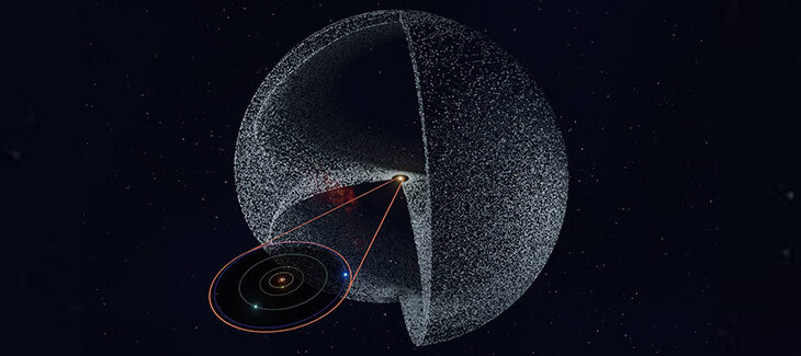 The Oort cloud, a massive shell of icy objects, is located in the outer reaches of our solar system. The Oort Cloud is a vast distance of 50,000 to 200,000 AU, about a quarter of the length to the nearest star. Because its outer boundary is not easily defined, the Oort Cloud is believed to be a region of vast area where the Sun’s gravitational pull is still greatest. Its inner boundaries begin at about 2,000 AU from the Sun and are at the edge between the Solar System and the Milky Way. The outer perimeter of the Oort Cloud can change as different stars pass by the Sun over millennia and is thought to define the cosmographic boundary of the Solar System.