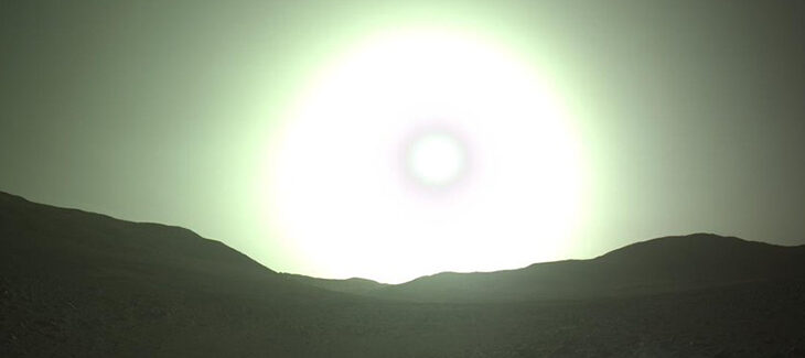 NASA’s Perseverance rover spotted a rare, strange “blue” event over the horizon of the Red Planet. In the photo, you can see the Sun setting below the Martian horizon and glowing a strange, cold, bluish-green color as the sky above the Red Planet darkens.
