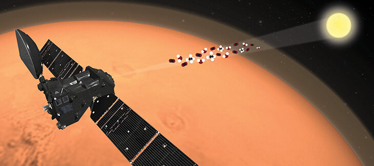 The ExoMars Trace Gas Orbiter (TGO), a project of ESA and Roscosmos, arrived on Mars in October 2016 and, using aerobraking techniques, entered a scientific orbit at an altitude of 400 km a year later. TGO’s primary mission, which began in April 2018, monitored the development of a global dust storm that ultimately led to the end of NASA’s Opportunity rover mission. TGO studied how the dust storm affected water vapor in the Martian atmosphere, which contributes to understanding the history of water on the planet.