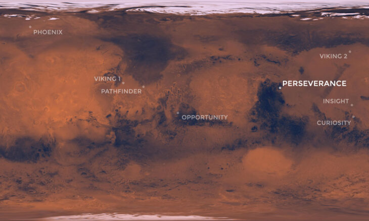 Image map of the global topography of Mars, overlaid with the position of Martian rovers and landers. Coloring of the base map indicates relative elevations of Martian surface. Credit: Wikipedia