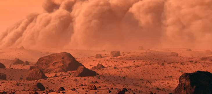 Annual dust storms on Mars cover areas the size of continents and last for several weeks. These are complemented by more giant, more intense storms that occur approximately every 5.5 Earth years and span the entire planet, known as “global dust storms.”