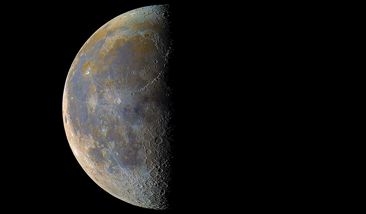 Looking at the Moon from Earth, we see its passage through different phases, that is, it changes its illuminated appearance from day to day. This is because the Moon orbits the Earth, with the same side of the Moon always facing the Earth due to tidal forces. This visible side of the Moon is illuminated by the Sun differently depending on the Moon’s position in its orbit. As a result, we see changes in the moon’s illumination that range from 0% (at a new moon) to 100% (at a full moon). The boundary between the illuminated and shadowed parts of the Moon is the lunar terminator.