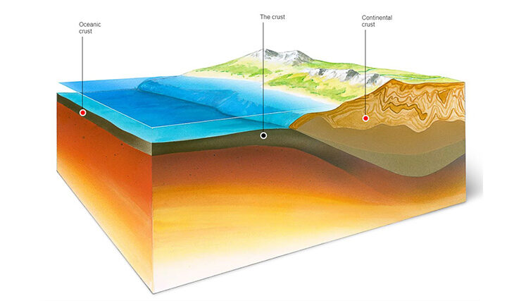 The earth has a much more varied crust. The thickness of the crust on Earth varies from 5-10 kilometers on the ocean floor to more than 30-40 kilometers on the continents. This diverse crust is made up of various types of rocks, including basalt, granite, shale, and others. The crust of the Earth is also actively changing due to the processes of tectonic activity, including mountain building and volcanism.