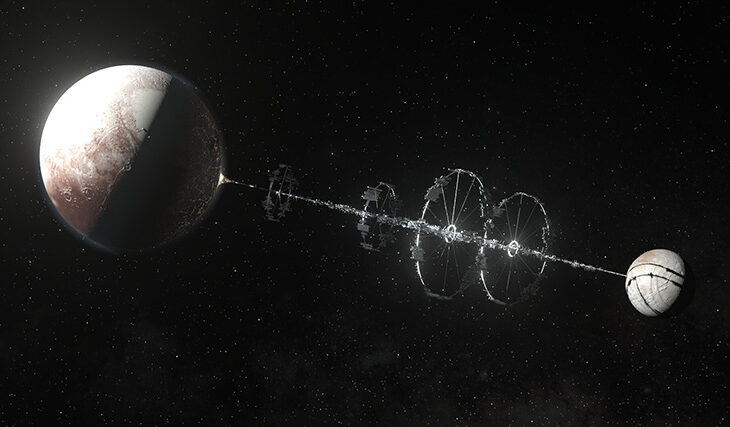 From Pluto’s surface, Charon appears as a disk about seven times larger than the moon’s apparent size in Earth’s sky. The unique orbital characteristics of Pluto and Charon create exciting opportunities for future development of similar technology. If you stand on Pluto’s equator, Charon will always be at the zenith, directly overhead. This provides a unique opportunity to extend a space elevator between them.