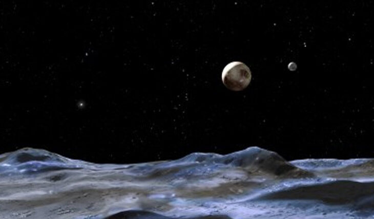 Banner image: The big planet is Pluto, seen from one of the newly discovered moons. To the right of Pluto is the large moon Charon and to the left is the second new moon as a small bright dot. Credit: ESA