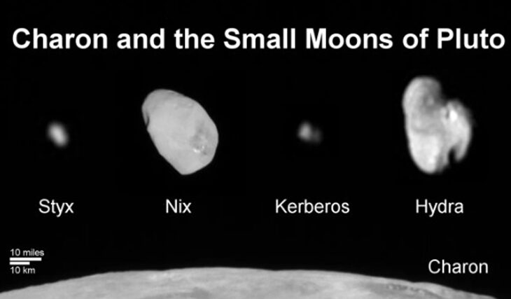 Banner image: Pluto’s moons to scale. The largest, Charon, is displayed along the bottom. Credit: NASA/JHUAPL