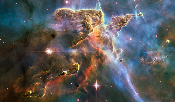 NASA’s Hubble Space Telescope has captured a billowing cloud of cold interstellar gas and dust in the Carina Nebula, 7,500 light-years away in the constellation Carina. This cloud serves as an incubator for new stars, creating a fantastic landscape of hot young stars that emit ultraviolet radiation and stellar winds. The nebula collapses, but some pillars remain and continue to form new stars.