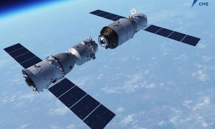 A render of the Tiangong space station, showing the Mengtian module (left) after docking with the Tianhe module (right) docking hub. Credit: CMSA