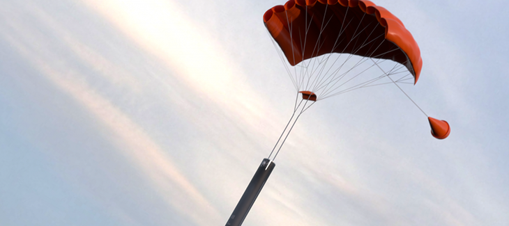 The Electron booster, descending under a parachute (right), as seen from the helicopter as it attempted to grapple the parachute. The helicopter released the booster moments later, though. Credit: Rocket Lab