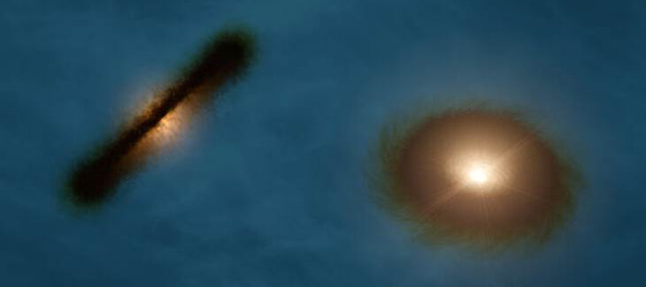 Stars and planets arise from clouds of dust and gas that rotate and collapse under the influence of gravity, forming protoplanetary disks around young stars. In binary systems like HK Tauri, the process is more complicated: if the orbits of the stars and disks are not aligned, this can lead to warped and elongated orbits of the planets.