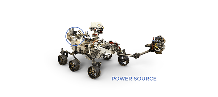 The rover’s power source, the Multi-Mission Radioisotope Thermoelectric Generator (MMRTG), converts heat from the decay of plutonium into electricity and charges its two primary batteries, as well as maintaining operating instruments and systems at optimal temperatures.